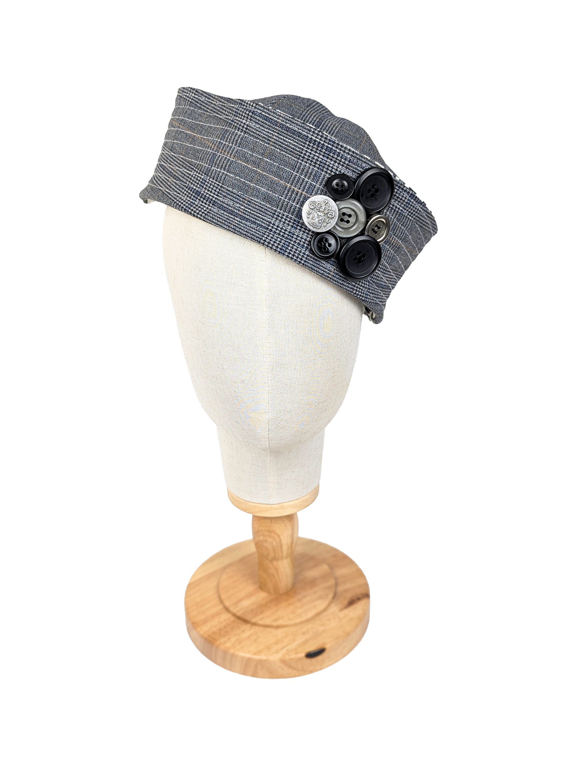 A one-of-a-kind reversible sailor hat, handmade from upcycled trousers and thoughtfully designed to transform leftovers into wearable art. This piece blends sculptural style with sustainable craftsmanship.