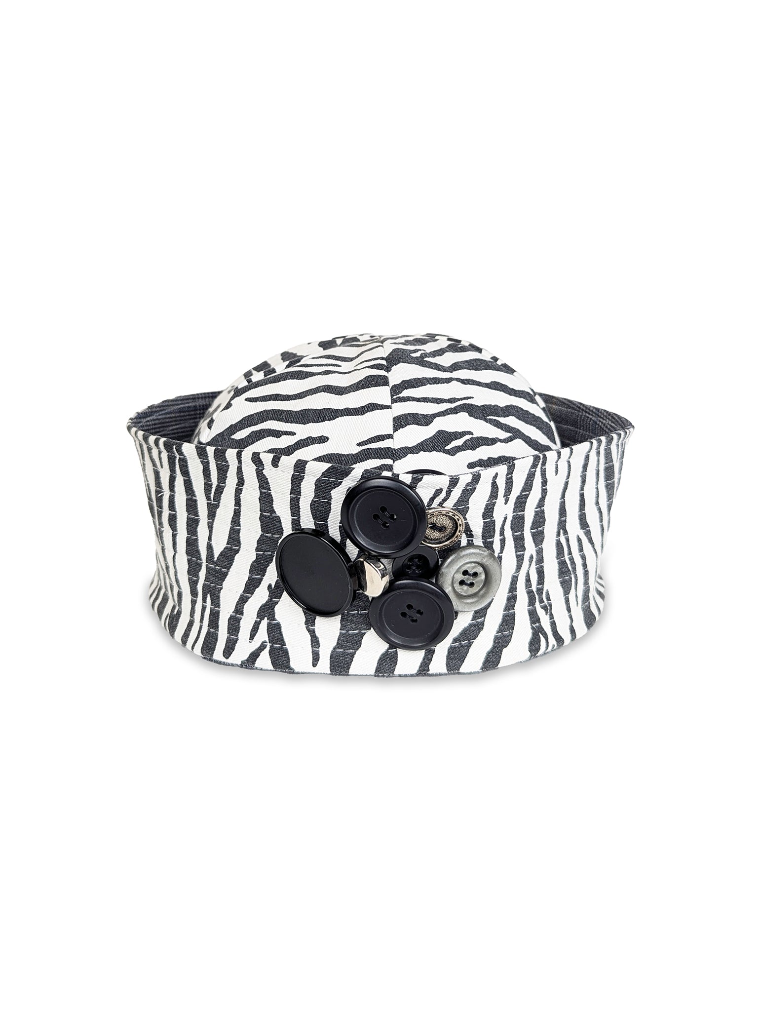 One side is crafted from a pair of zebra-print trousers, bold and playful with strong graphic character. The reverse side is made from classic checked trousers, offering a timeless and structured look. Both sides feature a cluster of reclaimed buttons, giving the hat a punk-inspired twist. Flip the brim down for a bucket-hat vibe; flip it up for a sailor-hat silhouette — four versatile looks in one sustainable accessory.