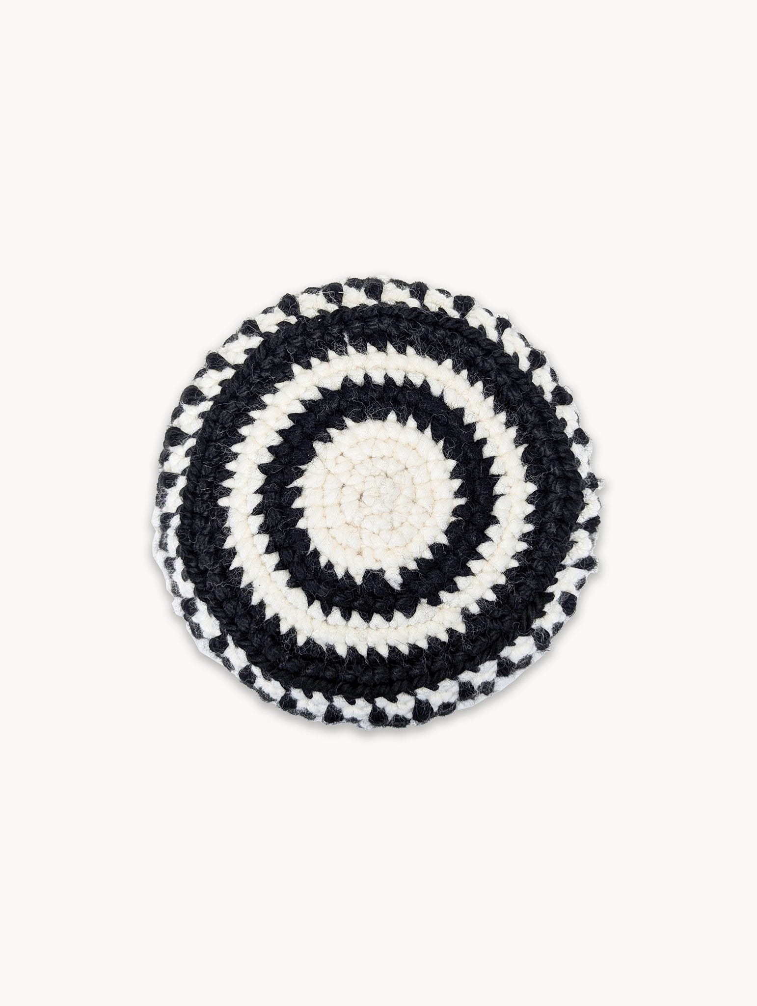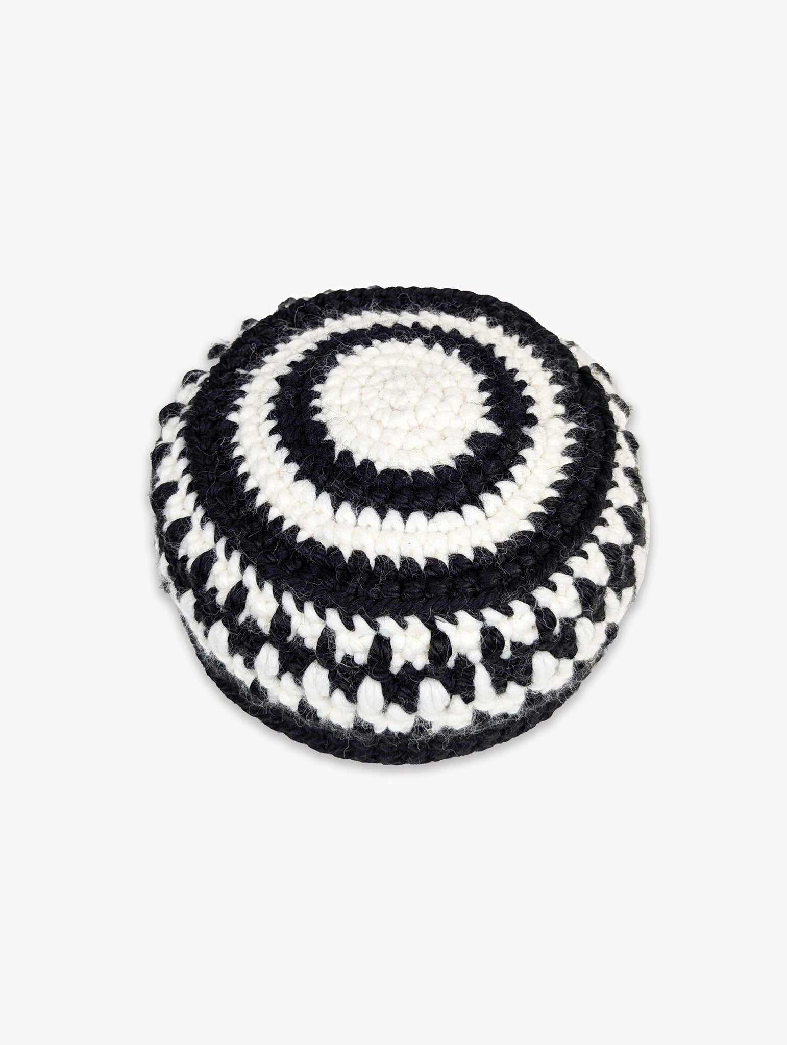 A sculptural crochet pillbox hat inspired by mid-century elegance and modern texture. Handcrafted in graphic black-and-white, this piece features tight stitches, crisp structure, and a clean finish that holds its iconic shape.