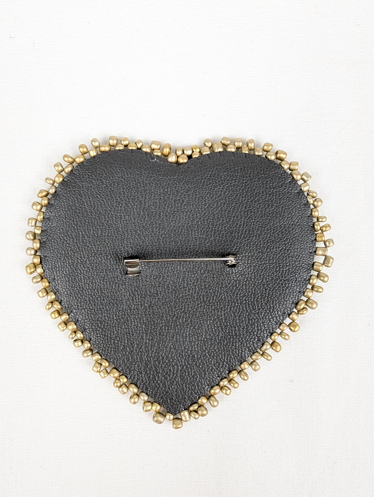 The heart-shaped design features a bold LOVE motif constructed from reclaimed fabric fragments, each chosen for contrast and texture. A border of gold-tone beads is stitched by hand, adding depth and subtle shine while framing the graphic message. Designed to be worn on jackets, hats, bags, or denim, this pin brings intention and emotion to everyday styling.
