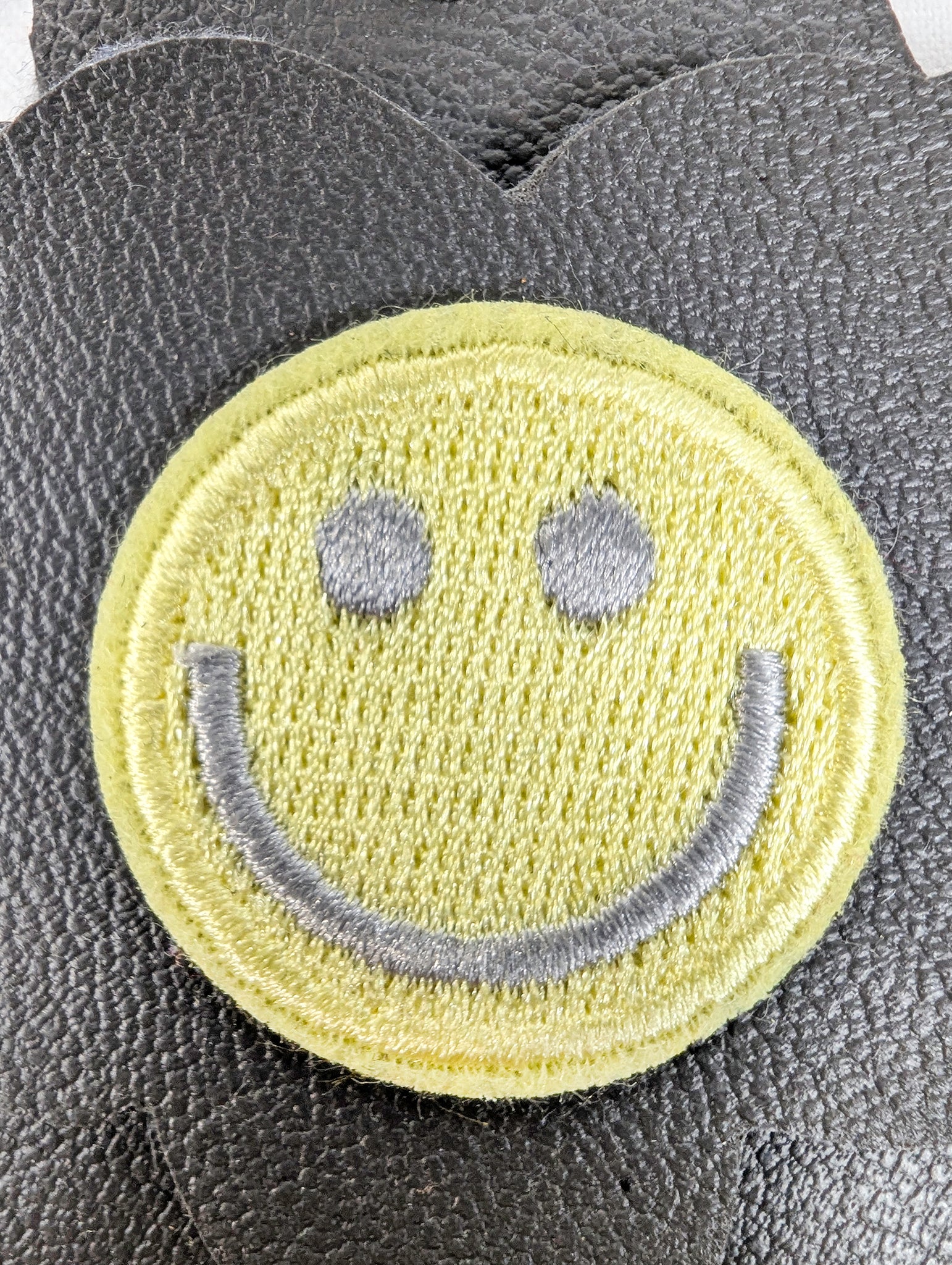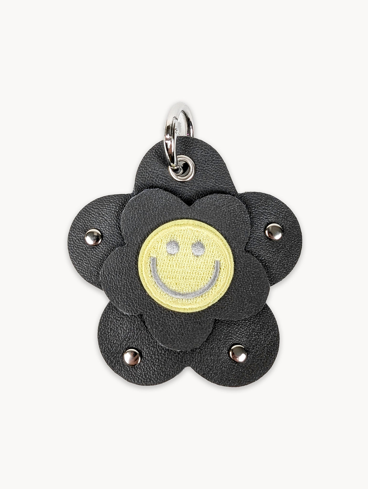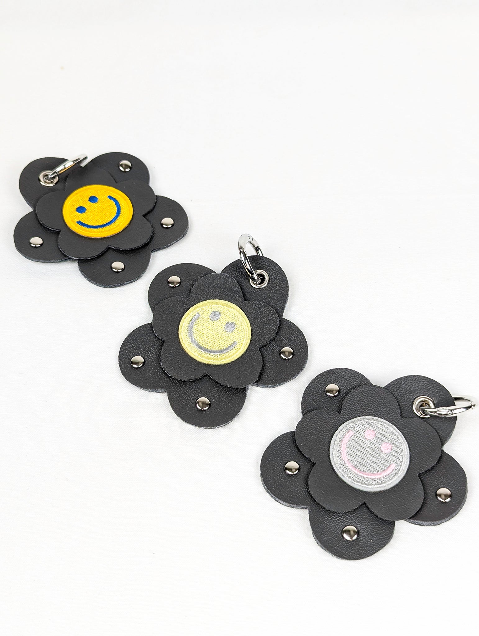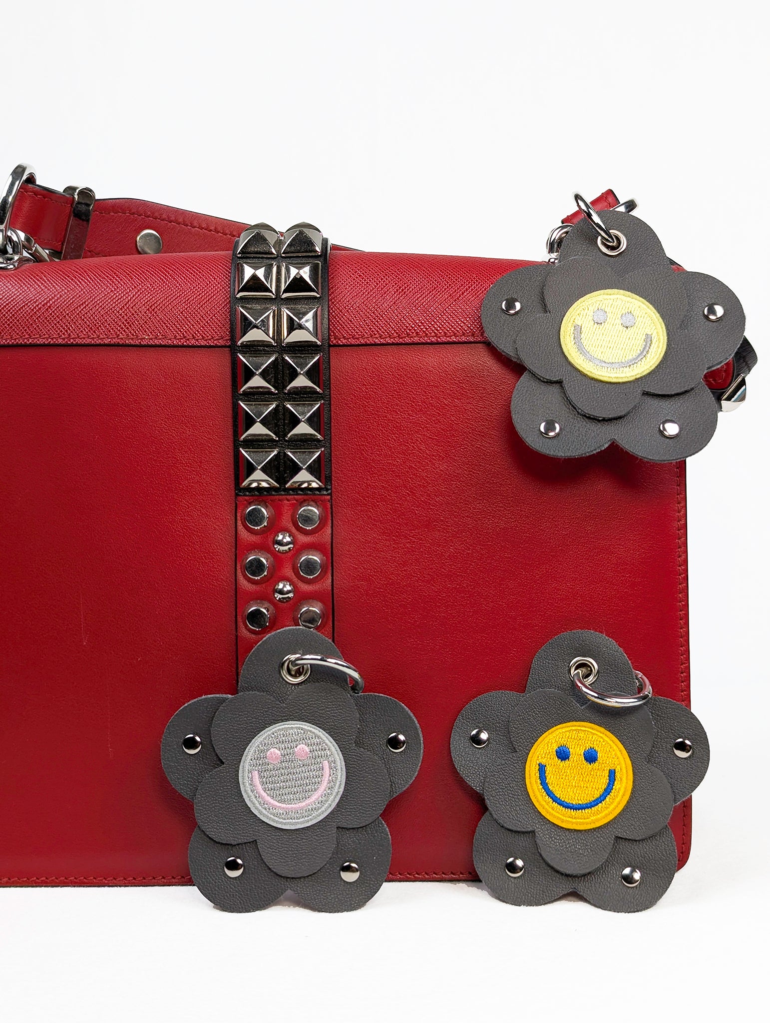 Each flower-shaped charm features a contrasting smiley-face motif, stitched onto reclaimed fabric and reinforced with metal rivet details. Finished with a metal ring, it can be attached to bags, belts, keys, or worn as a statement charm. No two are ever identical — every piece carries its own character and history.