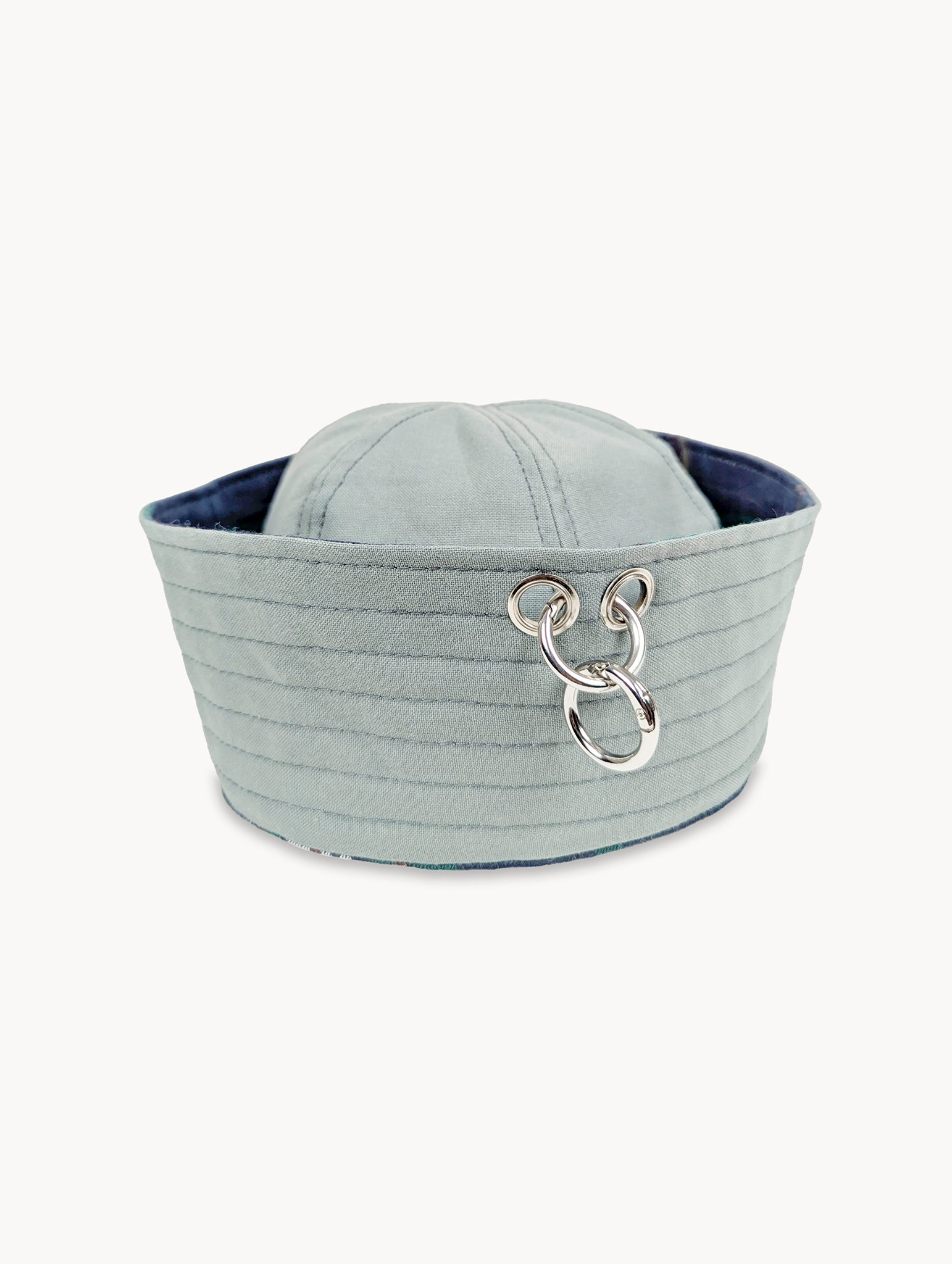 One side features a bold plaid fabric sourced from a secondhand shirt, while the reverse is crafted from soft cyan trousers. The brim is finished with two metal eyelets and detachable rings for an industrial, punk-inspired edge. Wear it with the brim flipped down for a bucket-hat look, or flipped up for a sailor-hat silhouette — four versatile styles in one sustainable accessory.